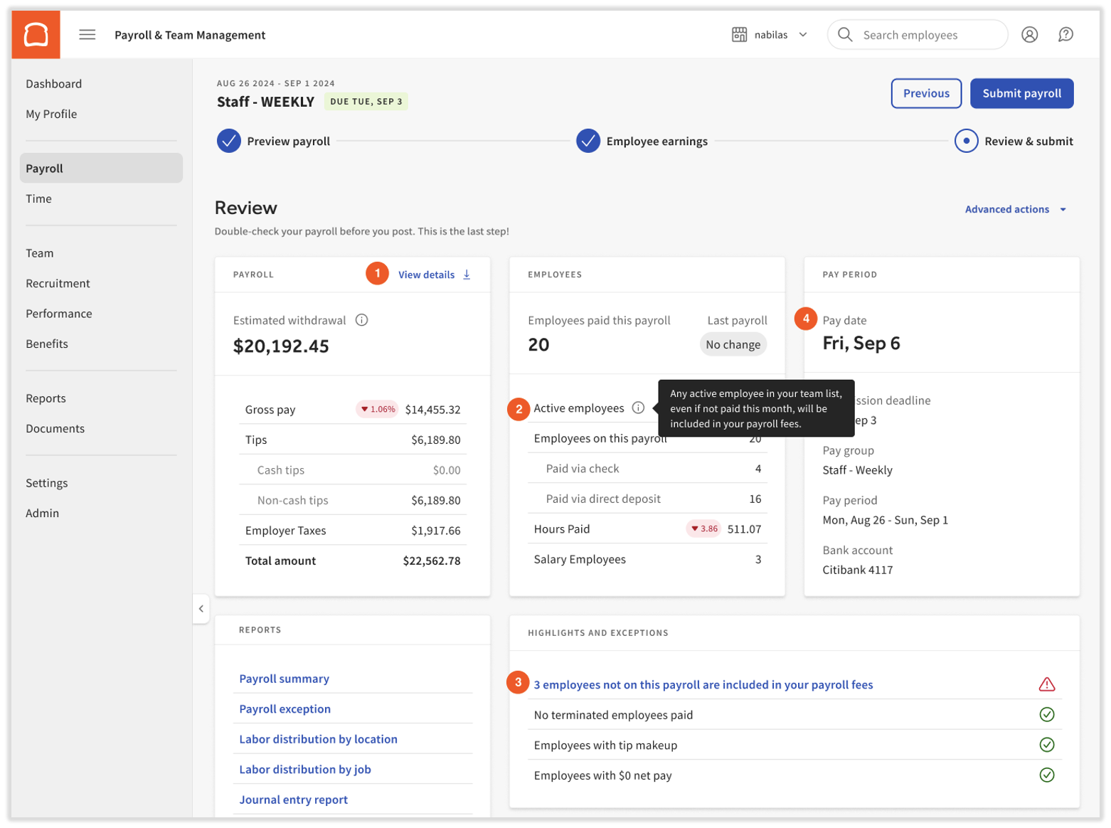 您可以在工资发放的“”步骤中查看在职员工人数。提交工资单后,您就可以查看每月的 SaaS 总费用(包括销售税)。将此处的每一项与下面的截图匹配: