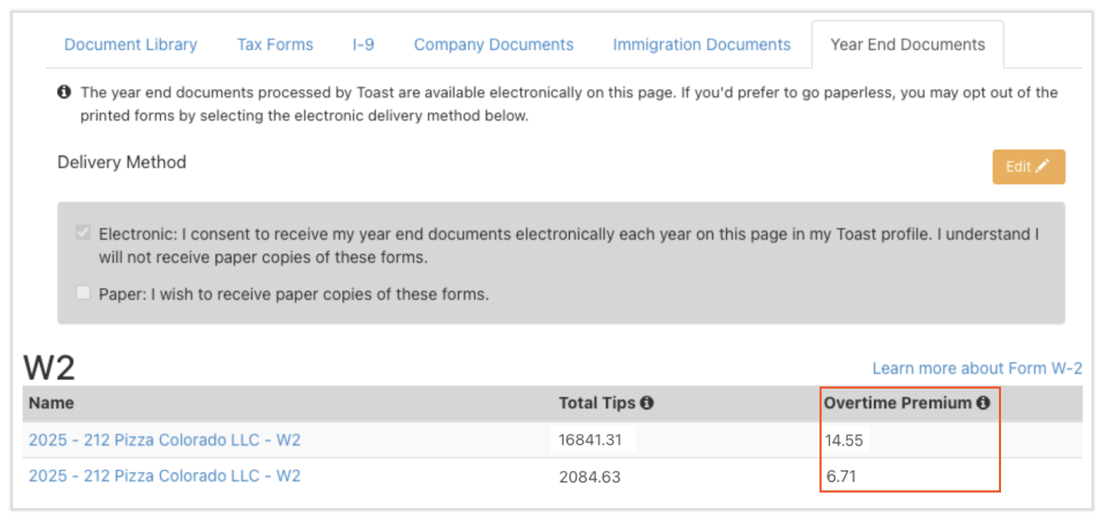 员工可以,然后导航至“我的个人资料”>“税费与文件”>“年终文件”。自 2026 年 1 月 19 日起,在提供 W-2 表格时,Toast 薪资管理系统计算的加班费金额将列在此页面每个适用的 2025 年 W-2 表格的旁边。2025 年 W-2 表格无需申报加班费金额。