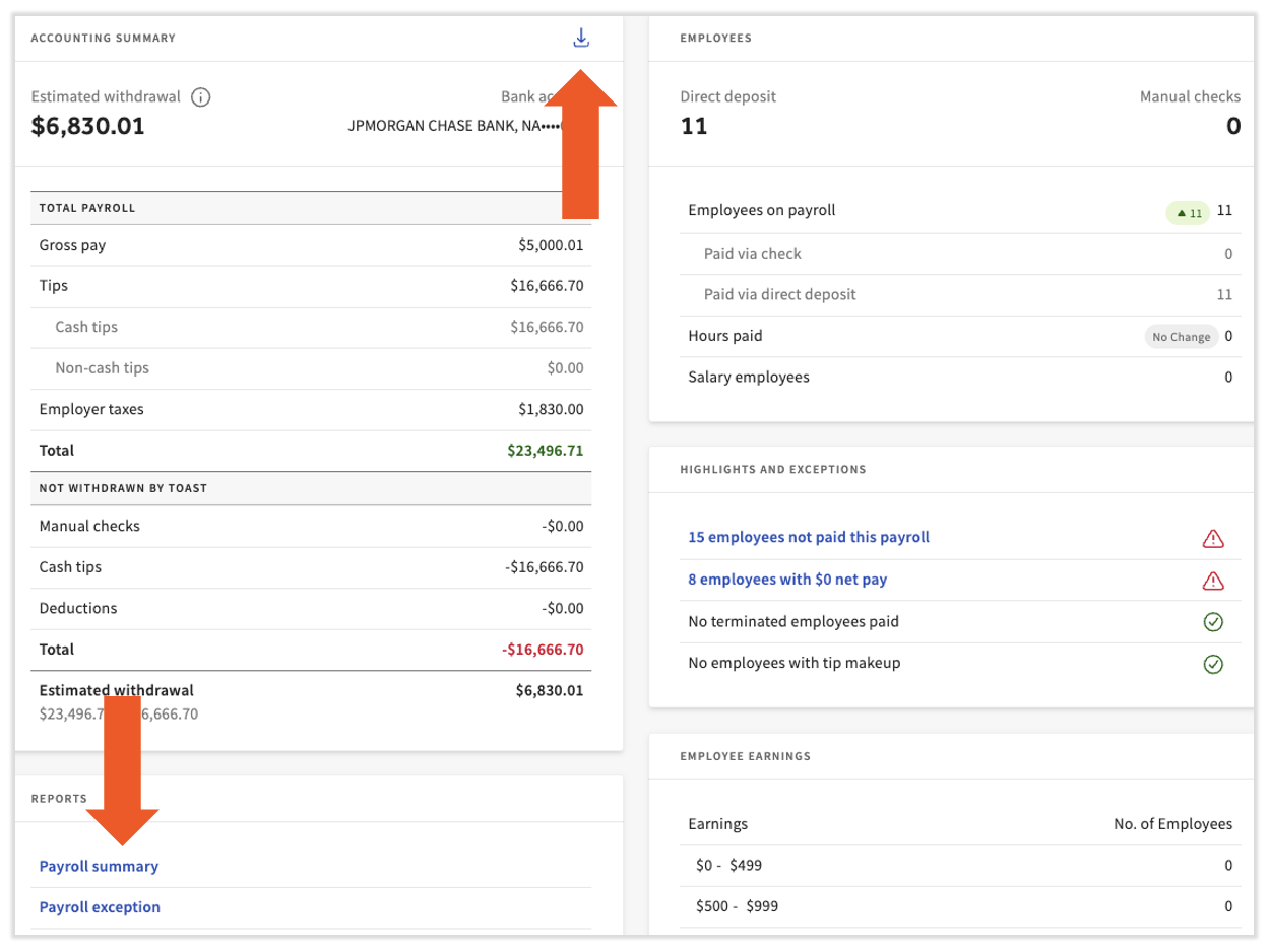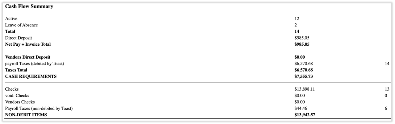 在提交薪资后,Toast Payroll会从我们为该支付组记录的银行账户中扣款。要了解薪资何时会从您的账户中扣款,请查看Toast Payroll:管理扣款和提款计划。扣款金额取决于您是从自己的账户开薪资支票还是从Toast Payroll的账户开支票: