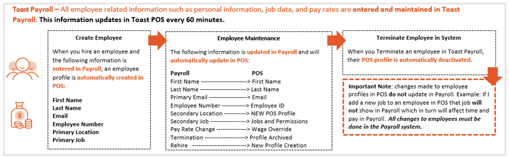 Toast Web 和 Toast 薪资管理系统旨在协同提供世界一流的餐厅管理系统。他们会将信息存储在不同位置,用于不同的功能,有时 Toast 的特定部分也会发生变化或更新,以达到预期效果。此页面将概述需要在两个系统中映射和同步的场景、进行特定更新的位置以及同步本身的详细信息。