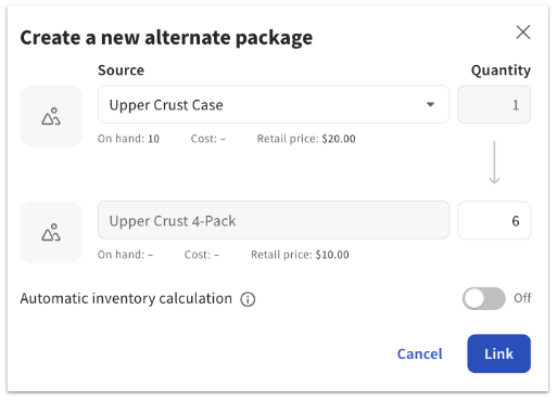 Toast 零售中的库存链接允许您通过使用两种新商品类型:捆绑和替代包装,在多个商品之间统一库存账户。捆绑是以特定价格点一起销售的商品组,通常在共享容器中,附有特殊的准备说明(例如,礼品篮、冷盘、啤酒飞行)。替代包装可用于当您收到希望以不同数量销售的基础商品时。这可能包括一箱啤酒,也可以作为4瓶装或单瓶出售,或者一瓶葡萄酒,既可以作为整瓶出售,也可以按杯出售(BTG)。