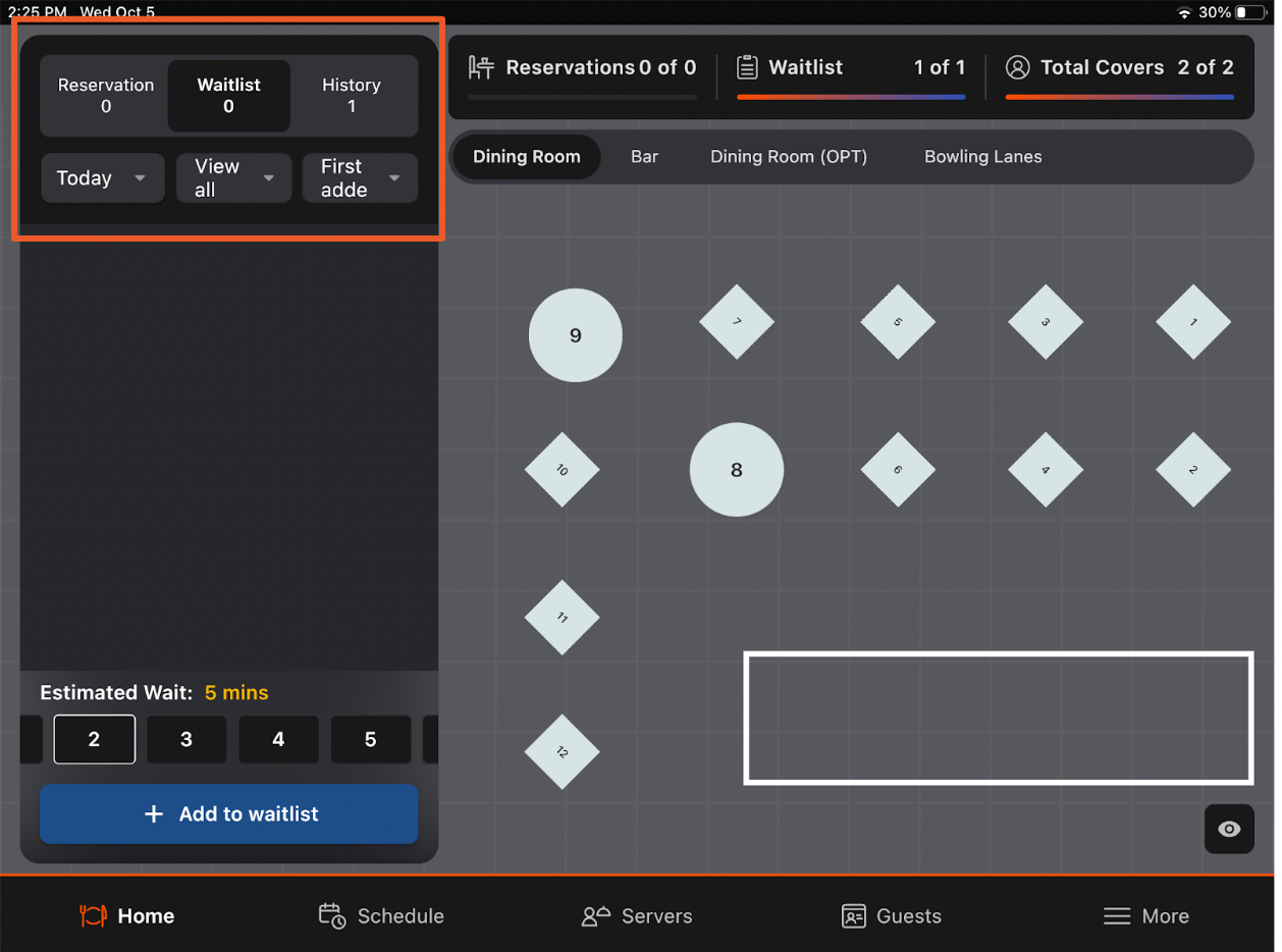 如果您有空桌供用餐团体使用,则不必将他们添加到等候名单。不过,对于无预约用餐团体,您可能更应该直接安排他们就座,而不是先添加到等候名单,以便 (1) 通过我们的 POS 机系统集成,实时同步桌位状态,以及 (2) 确保服务员总负责客人数的准确性。