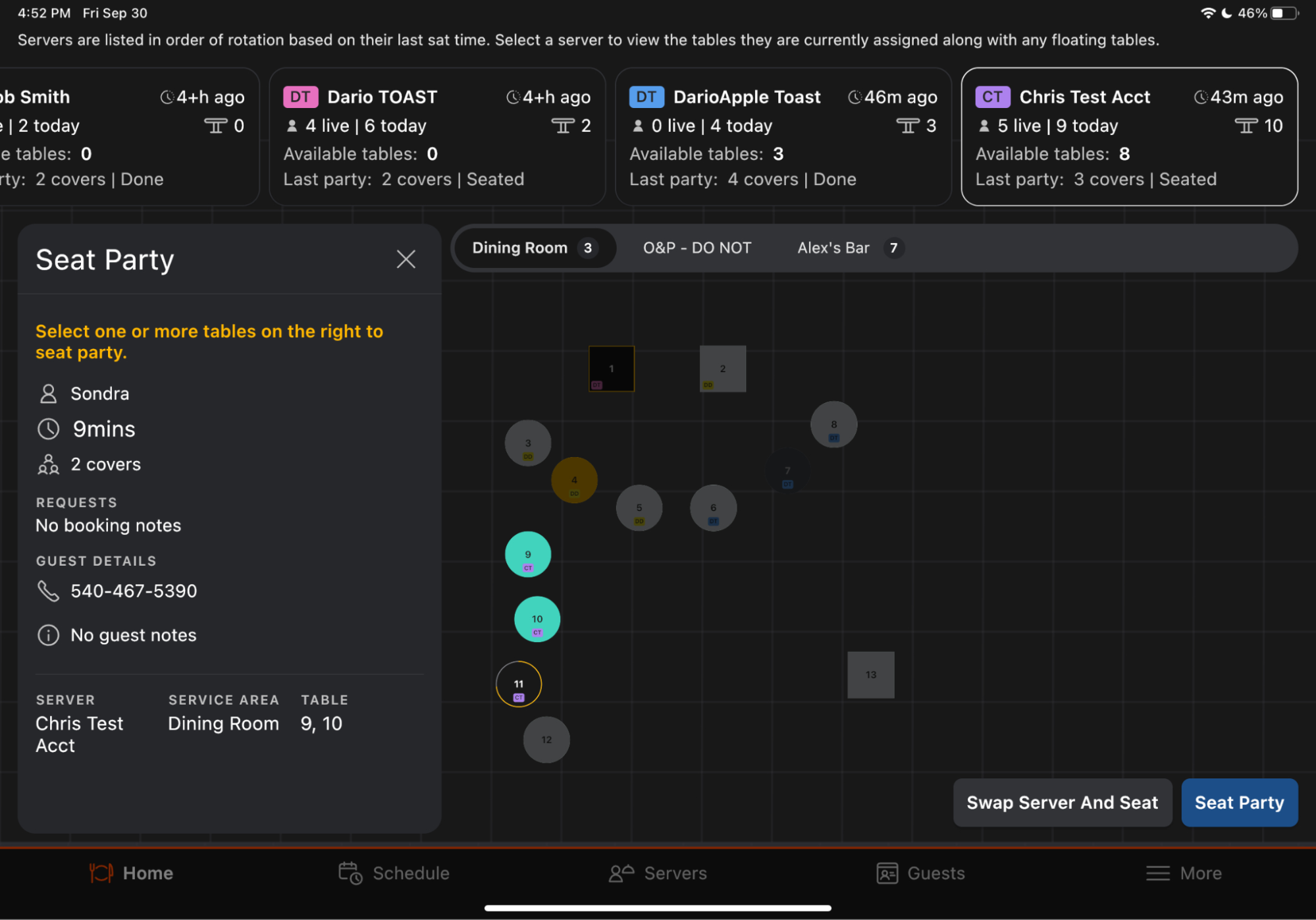 如果您的餐厅会预先分配区域给服务员,我们建议在每个班次开始时分配桌位。如果一位服务员休息,迎宾员仍然可以更换其他服务员。