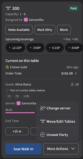通过选择桌位,您现可更改安排在该桌位的用餐团体人数(只需点击桌位并选择“更多操作”即可编辑用餐团体人数)。 桌位详情卡片(在选择桌位时显示)已经过重新设计,以便更快更改桌位状态,如下所示: