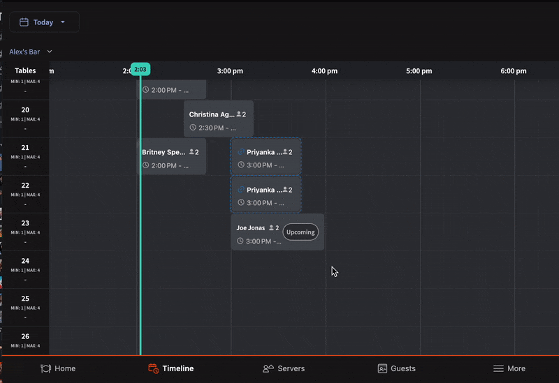 要从“客流量视图”创建预订,请选择界面底部的“时间线”按钮,然后选择您想要预订桌位的时间线。点击后会弹出一个方框,您可将其拖动至该预订的适当翻台时间。确定预订的合适时长后,在方框内点击即可填写预订的客人信息。