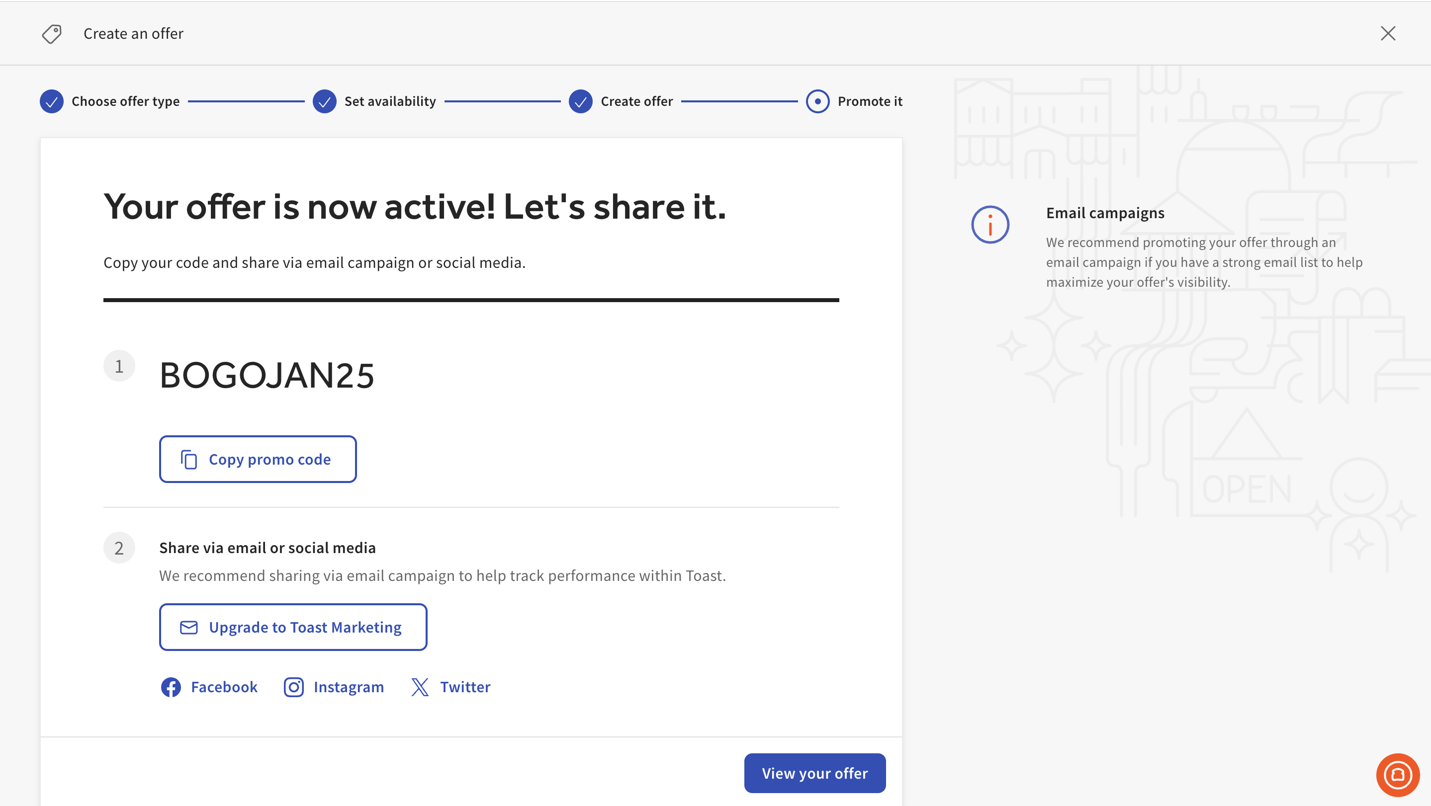Your offer is now active! You can now share your newly created offer in a new email campaign or to your social media accounts.
