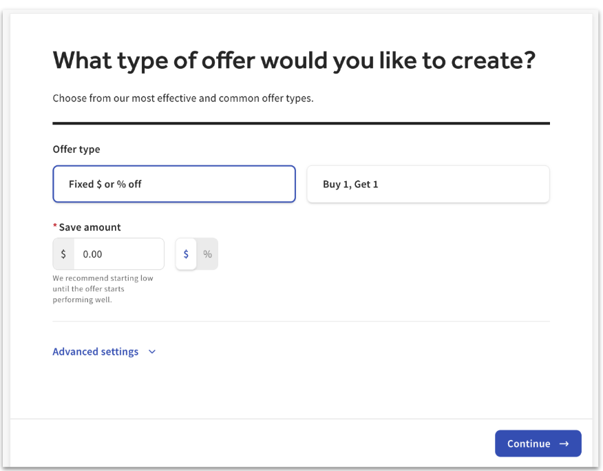Recommended offer types are provided based on common performance goals. We use our most effective offer types to help you meet your goal with data-driven insights helping us make recommendations.