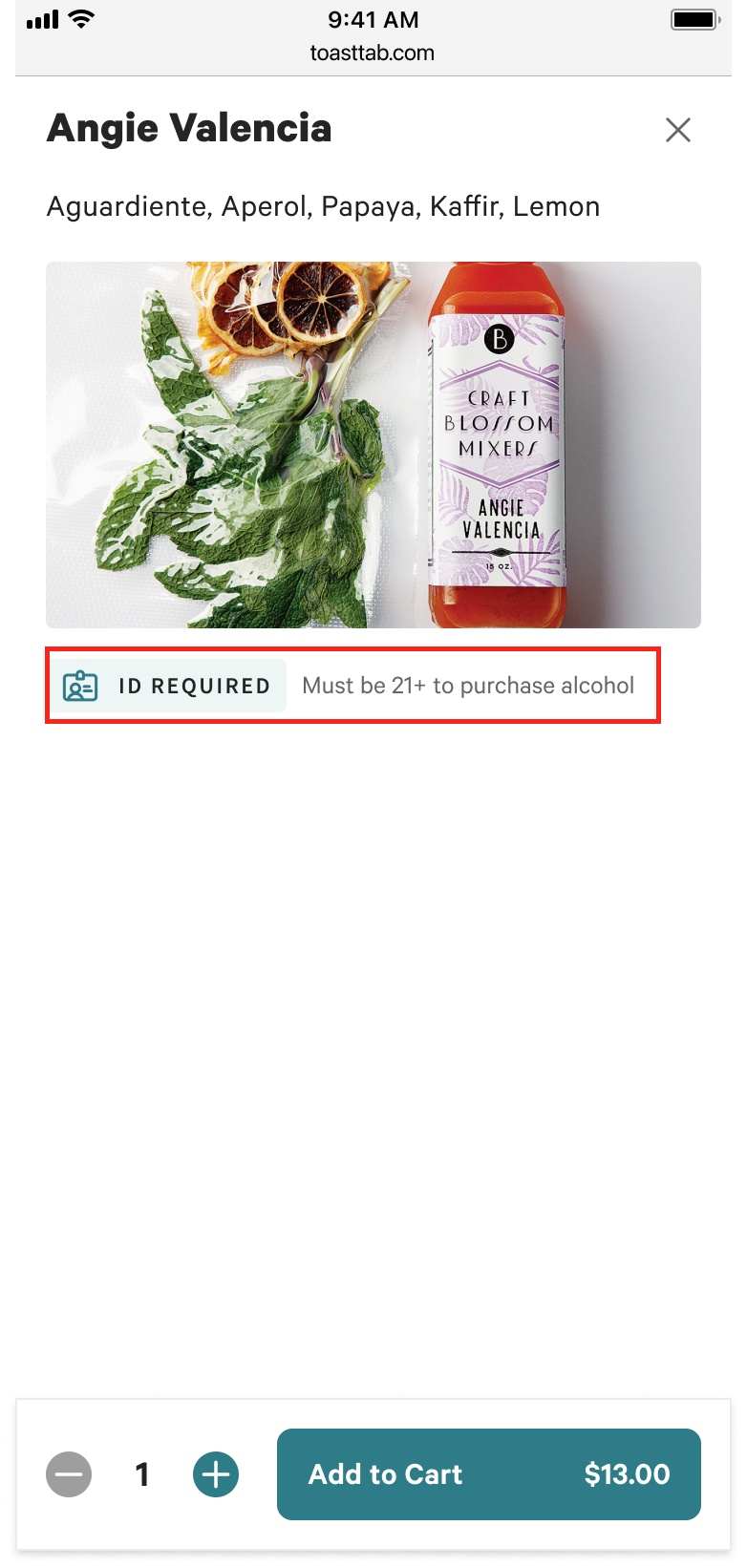 当客户通过Toast在线点餐(OO)订购酒精时,他们会收到多次年龄验证提醒,确保配送给21岁及以上的人。如果您使用第一方配送/TDS并将项目标记为含酒精,则适用此项。
