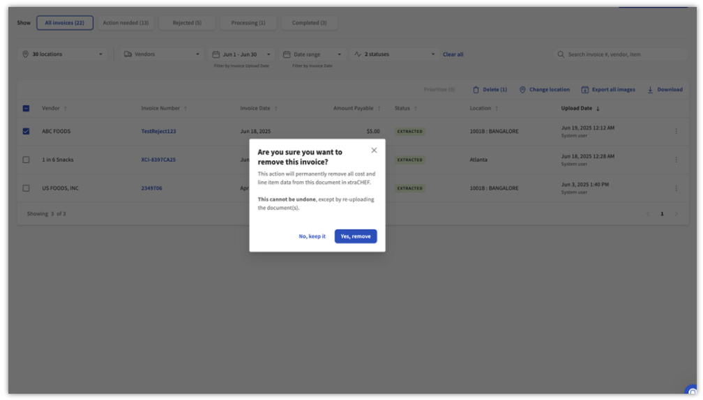 注意:此操作将永久删除xtraCHEF中发票的所有成本和行项目数据,且无法撤销。发票只能通过重新上传文档来恢复。