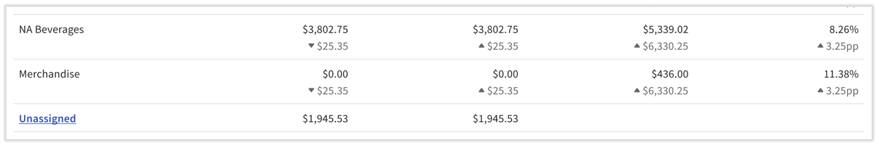 例如,您销售了价值 100 美元的啤酒:50 美元的 Corona,30 美元的 Bud Light 和 20 美元的 Budweiser。您为 Corona 和 Bud Light 创建了食谱并将其映射到啤酒类别,但没有为 Budweiser 做同样的事情。在这种情况下,您的报告将显示 20 美元的未映射销售,因为我们没有可用的映射数据。