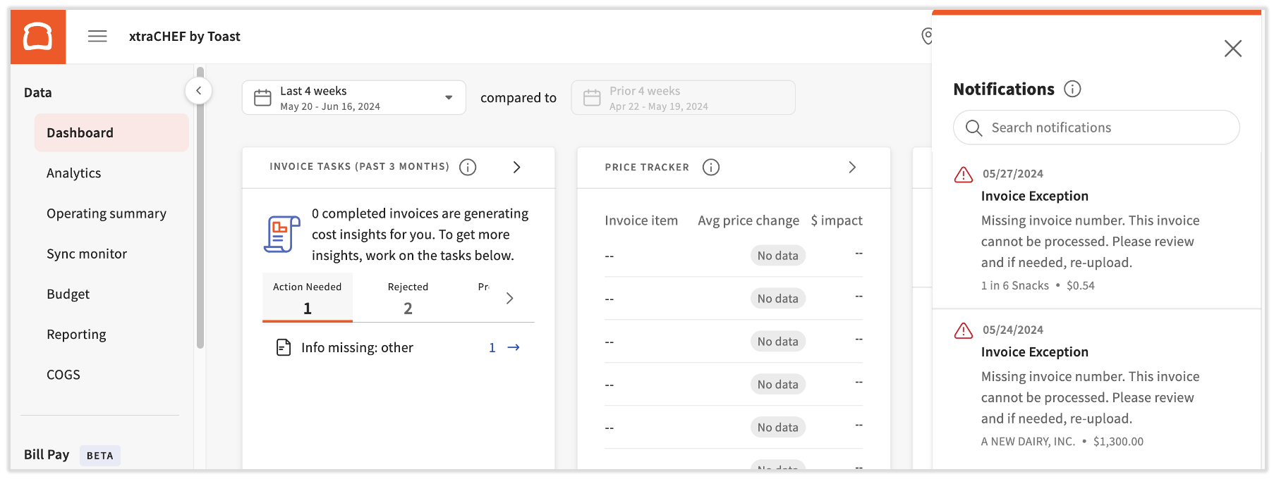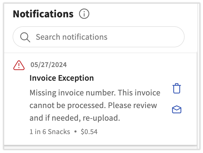 Your xtraCHEF notifications will appear when uploaded invoices are flagged for Action needed and paused from reconciling. Upon receiving a notification, taking action will help ensure exceptions are not overlooked and you're able to reconcile all invoices in a timely fashion.