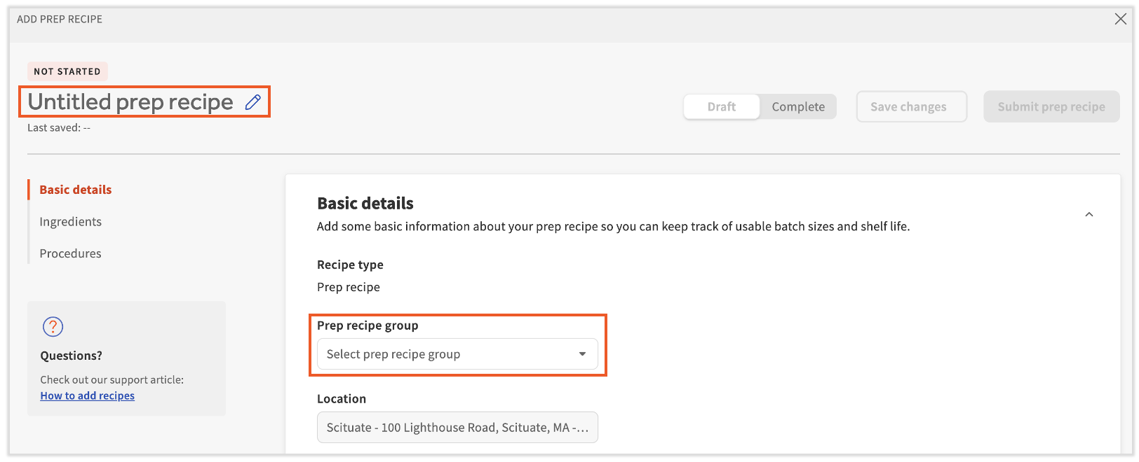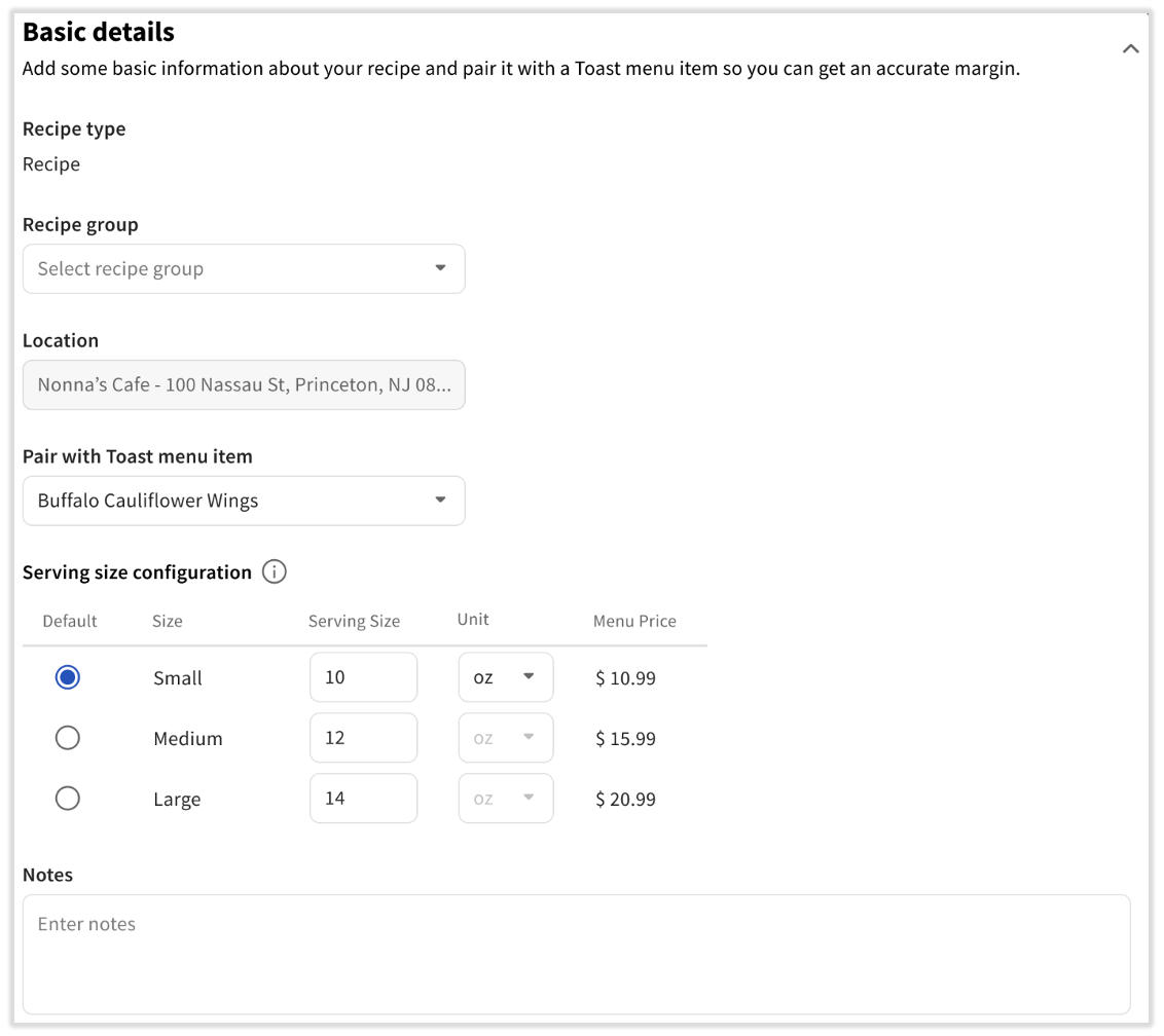 并非所有基本详情均为必填项。但是,我们建议始终将“食谱”名称(左上角带有蓝色铅笔图标)、“食谱组”归为“食谱”,并填写“与 Toast 菜单单品配对”(如适用)。
