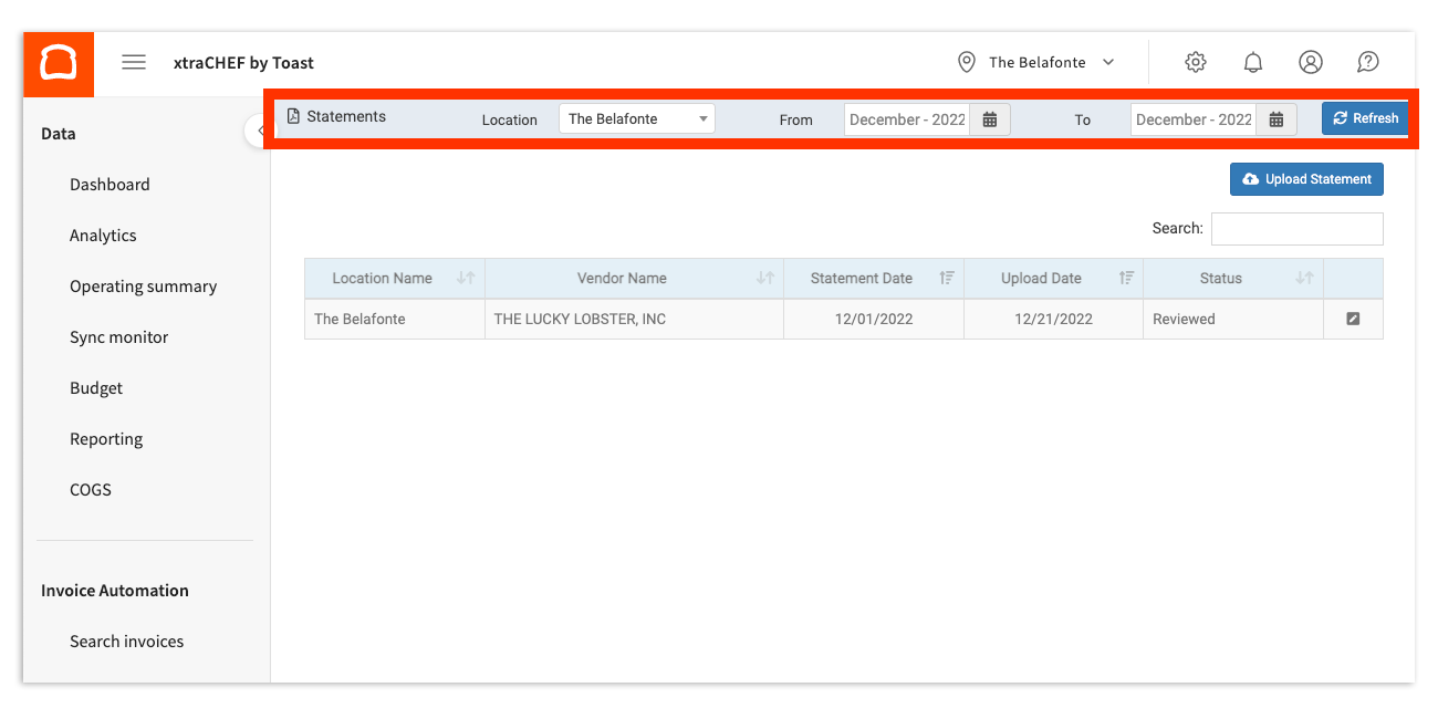 要对之前上传的发票进行对账,请返回您的声明页面。在这里,您将看到符合您默认位置和日期范围(当前月份)的任何现有声明。要查看前几个月或不同位置的声明,请使用顶部的过滤器调整您的标准。