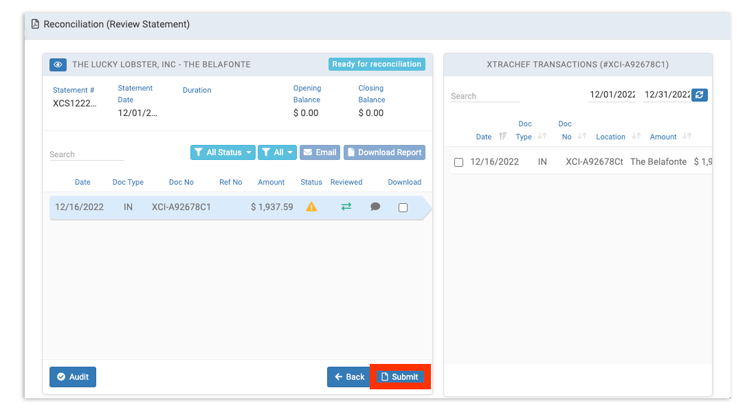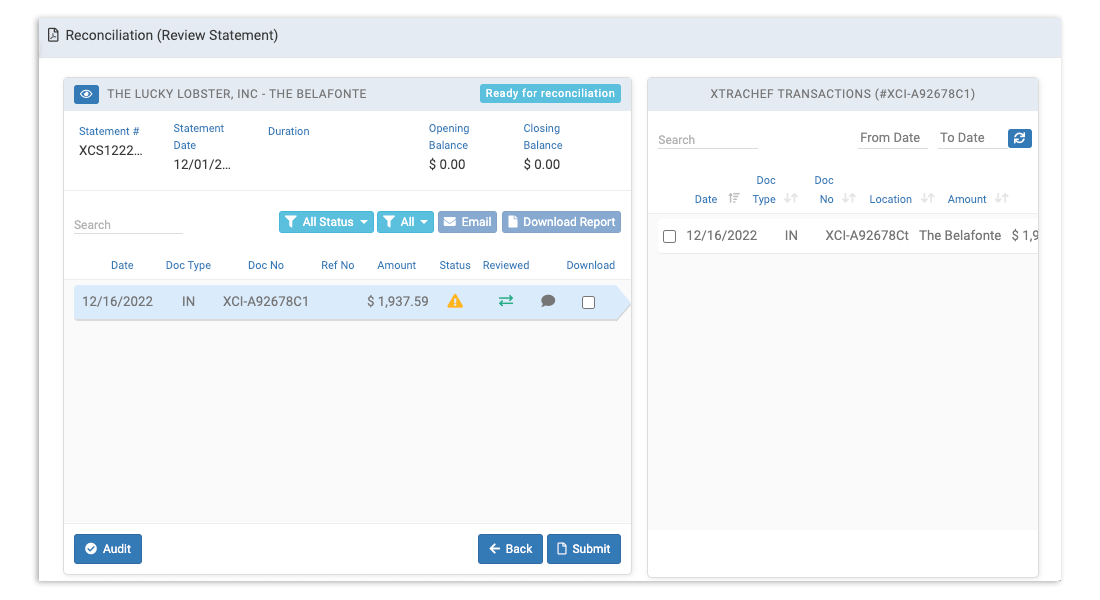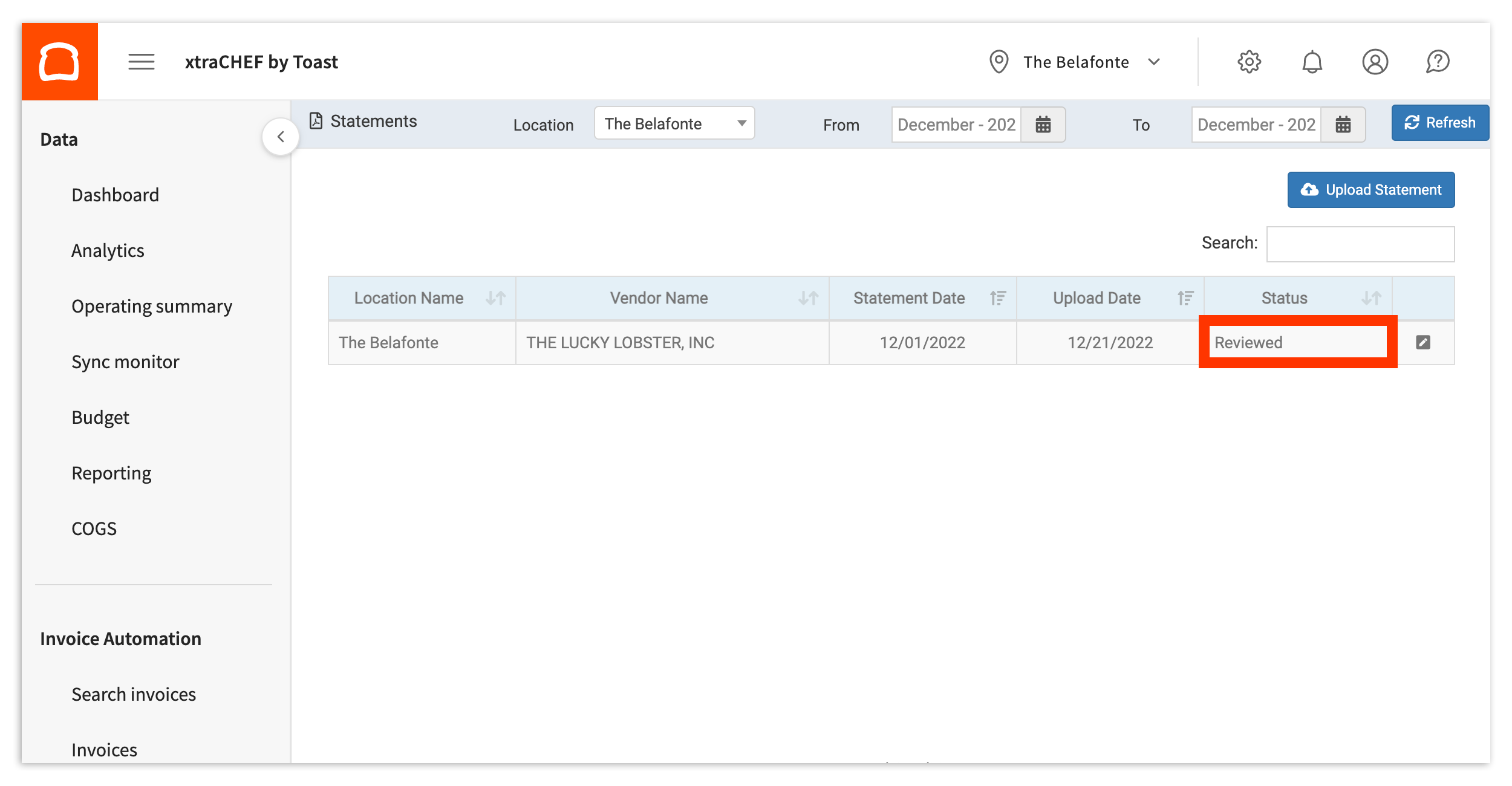 要开始,请导航到您的xtraCHEF帐户左侧导航中的对账单页面。在这里,您可以查看任何已上传的供应商对账单、对账供应商对账单或上传供应商对账单以进行对账。 注意:如果您在导航面板中未看到对账单,请联系support@xtrachef.com。